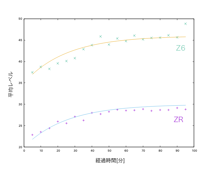 そこでZRとZ6については100分間ほど撮影し、同じ環境下でその時間変化を調べました。