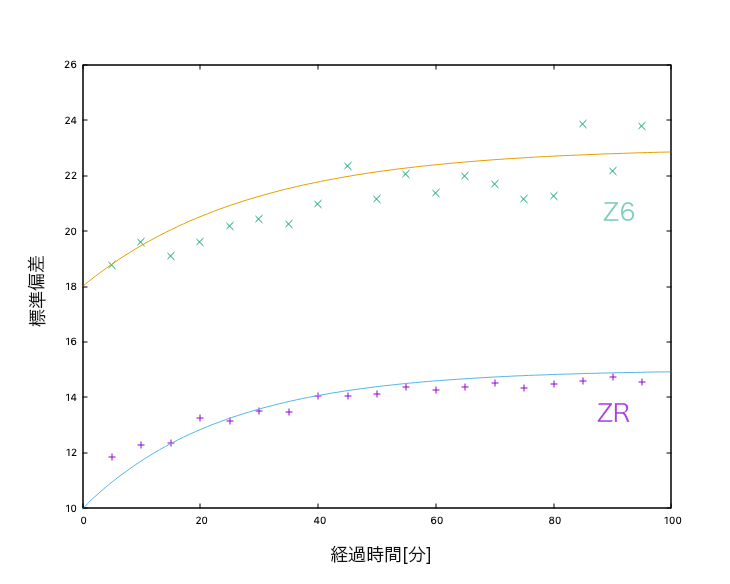 こちらを見てもやはりZRの方が小さいです。また温度が上がるとZ6はバラつく傾向がある。