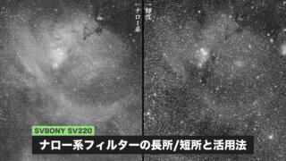 天体写真(機材)ナロー系フィルターの利点・欠点と活用法 光害地でも星雲の撮影をするために活用される、ナロー系フィルター。実際に撮影地で取得したL(輝度)のデータと、SV220で撮ったものを比較してみました。やはり3nmタイプ、効果は絶大な一方で、改めて暗い空での撮影も必要だと実感させられました。 2026.01.21天体写真(機材)